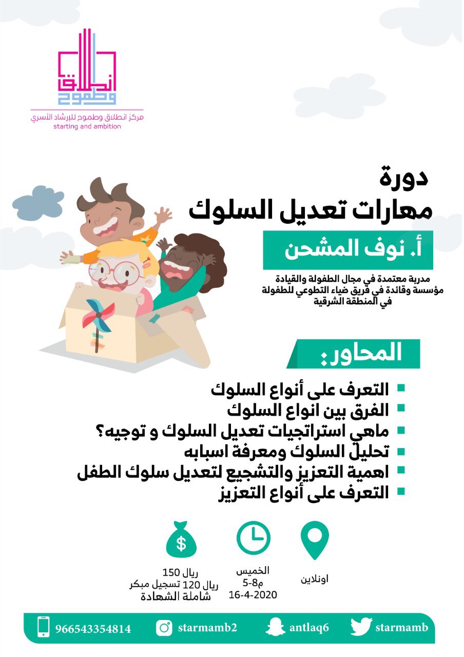 مركز إنطلاق وطموح Twitterissa اونلاين للتعرف على انواع السلوك شارك معنا في دورة مهارات تعديل السلوك مع أ نوف المشحن تقام يوم الخميس التاريخ 16 4 2020م للتسجيل عبر الواتساب Https T Co Jktlryou0s دورات تعليم عن بعد خلك في البيت