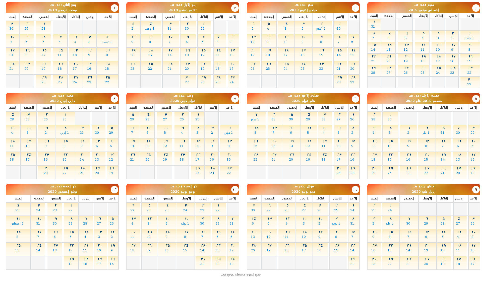 تقويم الزهراء ١٤٤١ التقويم الشهري لعام ٢٠١٩ ميلادي