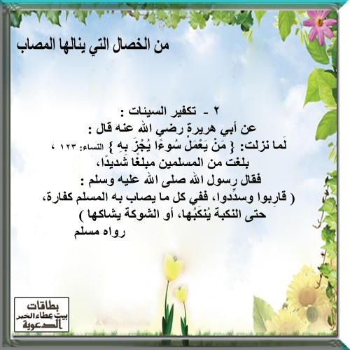 ما يصيب المؤمن من نصب ولا وصب ولا هم ولا حزن ولا أذى ولا غم حتى الشوكة يشاكها إلا كفر الله بها من خطاياه رواهالبخاري و مسلم. إل ا ك ف ر الل ه بها عن ه حت ى الش و ك ة ي شاك ها. م ا ي ص يب ال م س ل م م ن ن ص ب و لا و ص ب و لا ه م و لا ح ز ن و لا أ ذ ى و لا غم حت ى الش و ك ة ي ش اك ها إ لا.