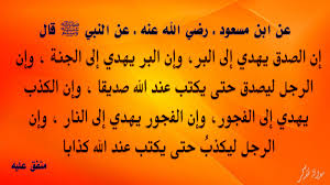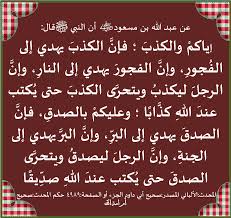 الصدق يهدي الى البر والبر يهدي الى الجنة والكذب يهدي الى الفجور والفجور يهدي الى النار